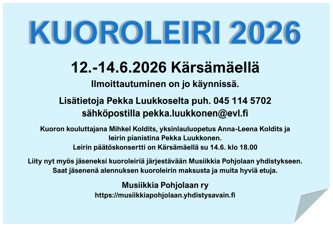 Seuraava kuoroleiri pidetään 12.-14.6.2026 Kärsämäellä.